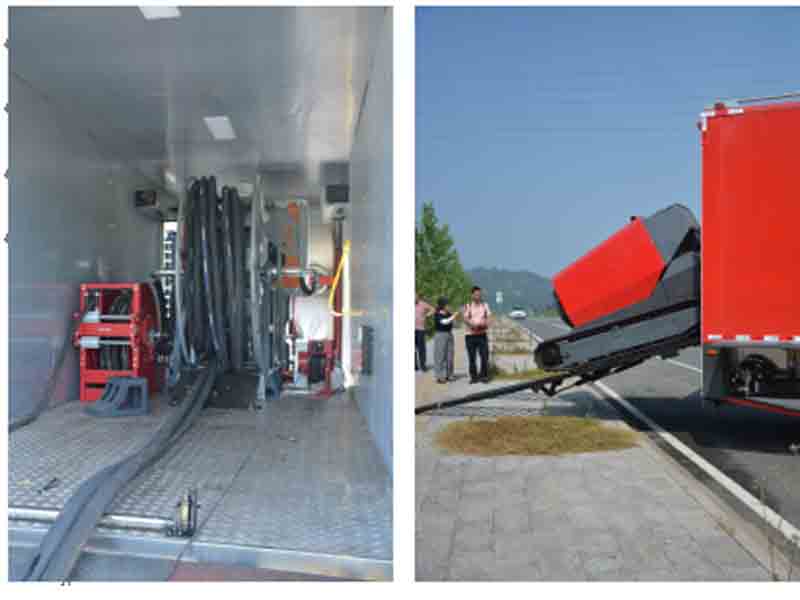 移動排水泵站及液壓系統(tǒng)放置室:車廂中段用于停放液壓裝置、液壓油箱及放置油管絞盤。車廂后門為下開式,行車時作為后門,保護(hù)車內(nèi)設(shè)施,當(dāng)子車下車時,可作為其階梯,使子車平穩(wěn)上下車。