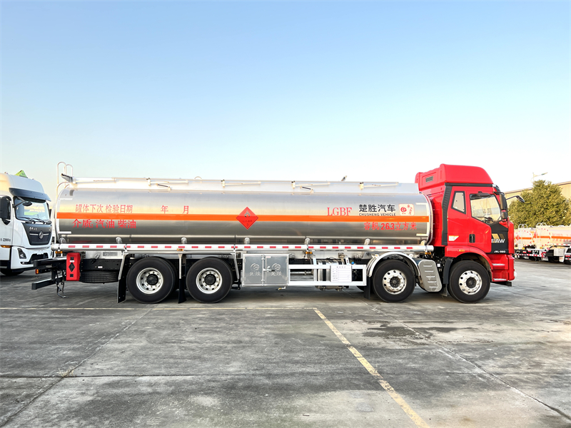 上裝配置: 嚴格按照公告尺寸罐體26.3方制作,2個歐標罐口 、1個海底閥,帶1個下裝油口,1個油氣回收,1個防溢流探桿及靜電插座,右邊一個泵箱,帶折疊護欄、兩根罐體等長輸油管、兩個滅火器、一個防火帽。其余標配,油漆:銀灰、貼反光條、反光帶、安全告示。